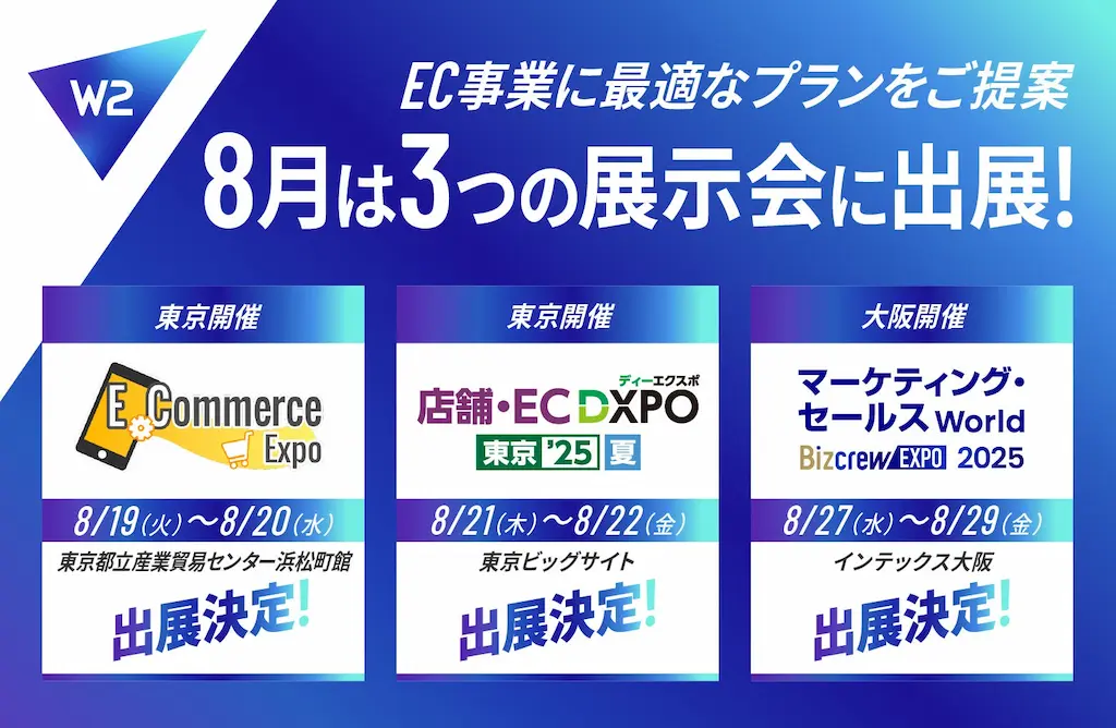 EC事業の「成功」にこだわる最先端ECプラットフォームを展開するW2株式会社(本社:東京都中央区、代表取締役CEO:山田 大樹、以下W2)は、8月度に3つの展示会へ出展することをお知らせします。展示ブースでは、総合ECプラットフォーム「W2 Unified」・サブスク/定期通販向けECプラットフォーム「W2 Repeat」のご紹介だけでなく、新サービスである受注業務のDX化により業務効率化・新規顧客開拓を実現する「BtoB向けECプラットフォーム」や、大規模EC開発、越境EC支援サービスなど、多岐に渡るサービス展開を通じて、事業者様のお悩みを解決するプランをご提案いたします。ご希望の事業者様には個別相談や実際の操作をお試しいただくデモンストレーションも実施いたします。