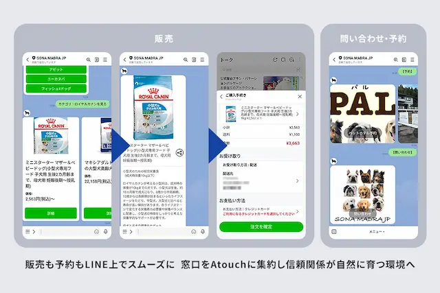 「Atouch」サービスは、LINEのトーク画面で商品を選んでそのまま決済まで完了できる便利なシステムです。買い物客にストレスフリーな購買体験を提供することで、事業者さまの売上機会の逸失を防ぎ、売上向上をサポートします。