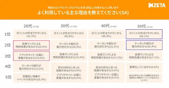 「ポイントが貯まりやすいから」が全世代共通で1位となりました。また、20代はお得感に加えて待遇や愛着といった感情的価値も重視する一方、50代は実利的なお得感を重視する傾向が見られました。