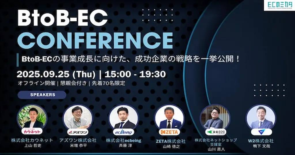ZETA株式会社(本社:東京都世田谷区、以下ZETA)は、顧客体験価値の向上を支援するため、2025年9月25日(木)にMIKATA株式会社が開催する『BtoB-EC CONFERENCE2025』で、代表の山崎が「顧客ロイヤルティとエンゲージメントで変わるBtoB EC」と題したセミナーに登壇いたします。