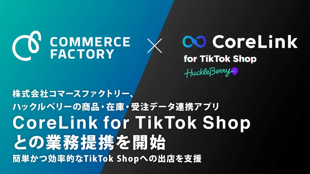 株式会社コマースファクトリー(東京都港区、代表:岡本 駿平、以下「コマースファクトリー」)は、株式会社ハックルベリー(東京都世田谷区、代表取締役社長:安藤 祐輔、以下「ハックルベリー」)が提供する、TikTok Shop連携専用コネクタ「CoreLink for TikTok Shop」との業務提携を開始いたしました。これにより、より幅広い事業者に向けて、簡単かつ効率的なTikTok Shopへの出店支援を届けていきます。