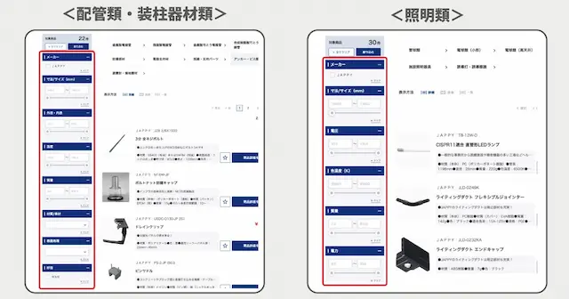 「カテゴリから探す」のタブを経由して表示された検索結果に対し、より詳細な条件で商品を絞り込める機能を実装しています。配管部材や照明器具など各カテゴリごとに、寸法・口径・質量・材質など業界特有のスペック項目による絞り込みが可能で、専門的なニーズに応じた検索精度の向上を達成しています。