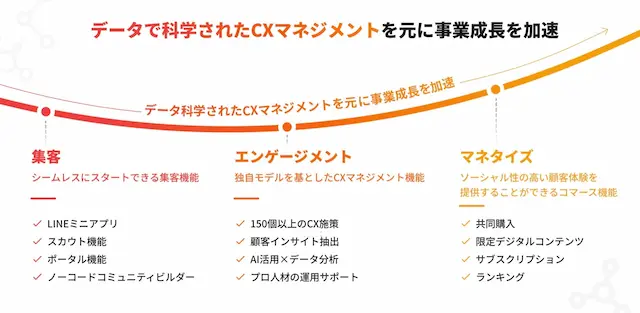 ユーザーの行動を科学しデータ分析でコミュニティ運営課題を可視化。さまざまな機能を活用してCXマネジメントを支援し、顧客とのエンゲージメントを高め、マネタイズ効率を最大化します。