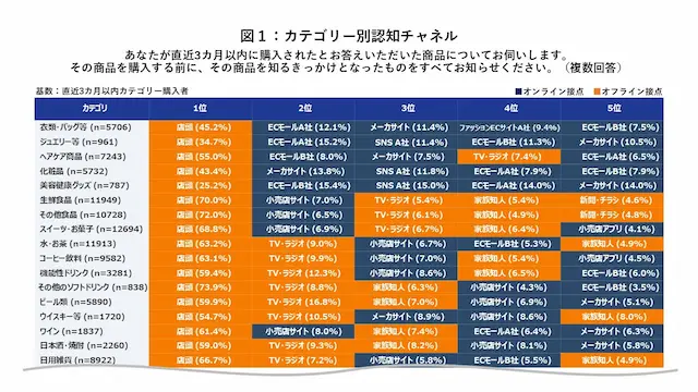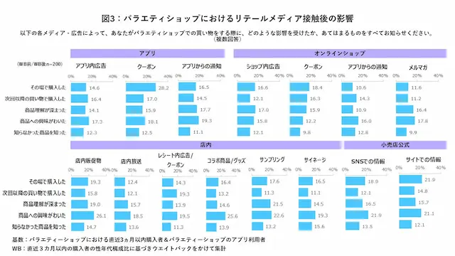 ・商品理解:バラエティショップのクーポン、サイネージ、流通アプリ内広告の影響力が比較的高い結果となりました。