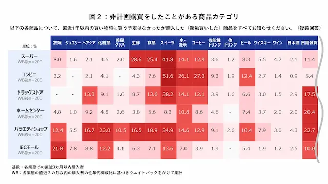 買い物時に買う予定はなかったが購入した非計画購買について、「食品・スイーツ」「飲料」「日用雑貨」は食品スーパーやコンビニ、ドラッグストア、バラエティショップで、「ファッション」「美容・コスメ」はバラエティショップやECモールで起きやすい傾向が明らかとなりました。