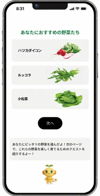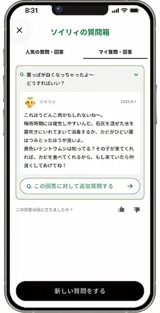 - 栽培中に分からないことがあれば、アプリから質問するとキャラクターが生成AIを活用してアドバイスします。