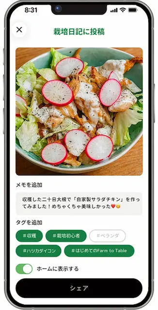 - 育てた野菜を使ったレシピも紹介されており、作った料理の写真や感想を栽培日記として投稿し、他ユーザーと共有可能です。