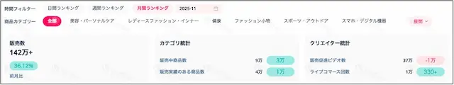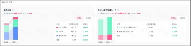 ライブ配信とカゴ付きショートビデオの2指標で比較した場合、7月〜10月に続き、販売の主流は引き続きビデオ経由となっています。一方で、11月の前月比成長率に着目すると、ライブ配信経由の販売は 25%増 と大きく伸長し、ビデオ経由の 7.9%増 を上回りました。このことから、ライブ配信の実施頻度が以前より増加し、その影響が売上成長にも反映され始めていることが示唆されます。
