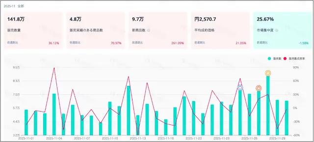 10月は成長率が一時的に鈍化したものの、11月には大幅に回復し、再び強い成長基調へ戻っています。この背景としては、新商品数の急増に加え、ブラックフライデーセールなどの大型販促施策が、成長率を大きく押し上げた要因であると考えられます。また、平均販売単価にも大きな変化が見られました。7月〜10月は概ね2,000円前後で推移していたところ、10月の2,123円から11月は2,570円へと447円増加しており、これも11月の重要なトピックの1つとなっています。