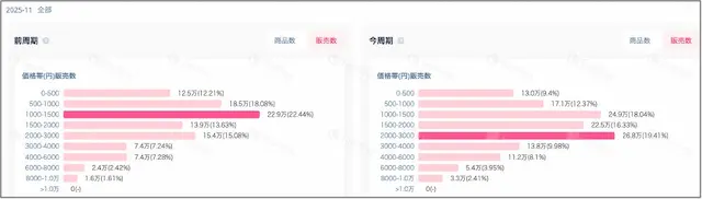 当月(11月)と前月(10月)を販売価格帯別に比較すると、0〜1,500円の低〜中価格帯は販売数量がわずかに増加したものの、全体として大きな変化は見られません。一方で、1,500円以上の中価格帯〜高価格帯の商品が大きく伸長しています。