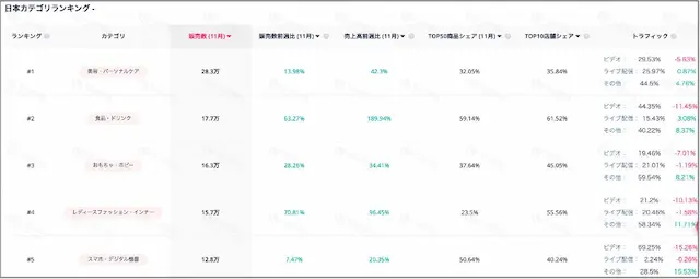 10月に続き、11月の1位は「ふわふわブランケット(店舗:Cashio)」で、推計販売数は約1.2万個でした。2位・3位には食品カテゴリから「お米(店舗:サンシャイン生鮮館)」がランクインし、店舗ライブでは同時接続数が1万人近くに達するなど、大規模なライブ配信が販売拡大に大きく寄与しています。さらに、4位には「ターメリック洗顔石鹸(店舗:Daisy Jp)」、5位には「ビタミンCサプリ(店舗:ELLISS-エルリス-)」が新たに登場しました。売れ筋上位にサプリメントがランクインするのは今回が初めてであり、美容・健康カテゴリの裾野が広がり始めている兆候が見られます。