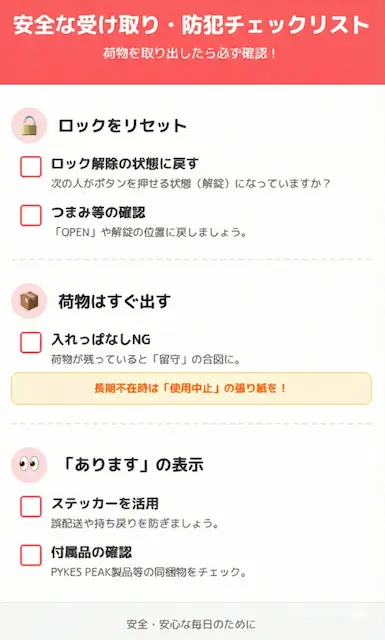 対策:配達業者向けに、正しい使用方法を案内するマグネットを掲示し、投函後の施錠を促すことを推奨します。