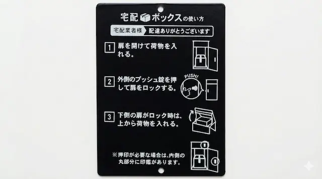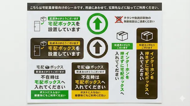 対策:表札の近くやインターホン横に「宅配ボックス設置済み」のステッカーやマグネットを掲示することで、確実な利用を促せます。