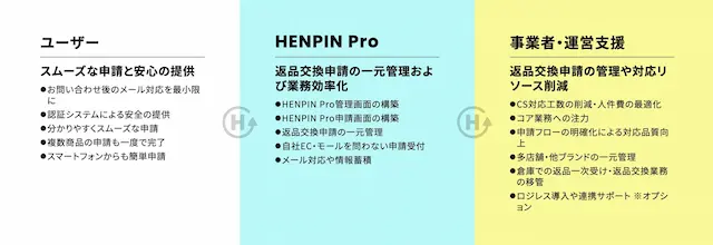 HENPIN Proは、返品・交換対応の業務を最適化し、スピーディーかつ正確な対応を実現します。事業者や運営支援会社は、煩雑なやり取りや手作業を減らしながら対応品質を向上させ、運営負担を大幅に軽減することが可能です。
