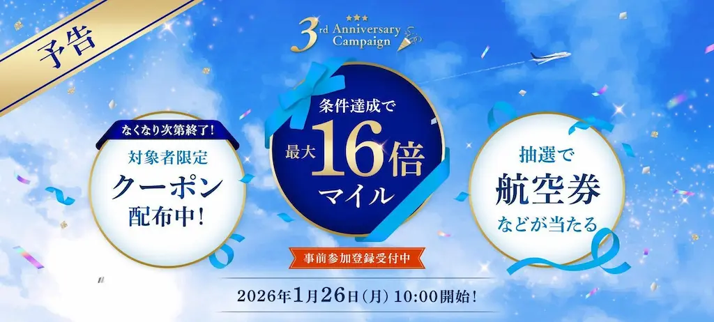 この度、日頃ANA Mallをご愛顧いただいているお客様への感謝の気持ちと、今後もANA Mallをご利用いただきたい気持ちを込めて、2026年1月26日(月)~2月16日(月)の期間において、過去最大級のマイルアップ等を含む「3周年キャンペーン」を実施いたします。