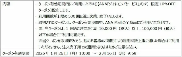 - ANA「ダイヤモンドサービス」メンバー限定10%OFFクーポン