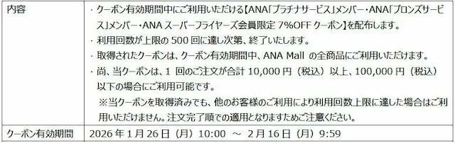 - ANA「プラチナサービス」メンバー・ANA「ブロンズサービス」メンバー・ANAスーパーフライヤーズ会員限定7%OFFクーポン