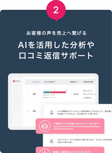 集約した口コミやアンケートをAIが解析・スコア化することで、分析の難しいお客様の声を様々な軸で定量的に分析し、経営判断や店舗改善に役立てることができます。また、口コミの返信もAIがサポートするので、お客様との円滑なコミュニケーションも実現します。