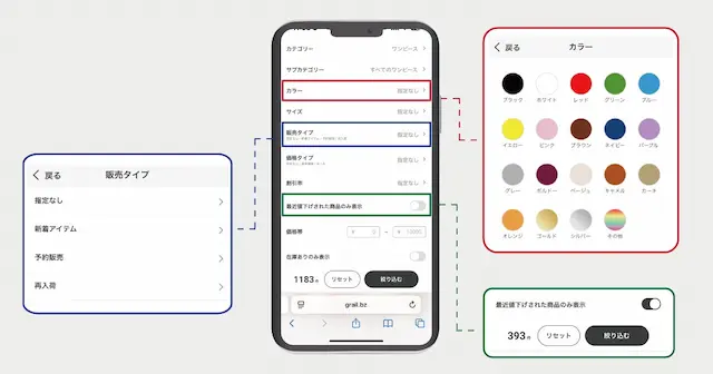 検索結果ページにて「カラー」や「販売タイプ」「最近値下げされた商品のみ表示」など細かな条件での絞り込みが可能となりました。この機能により、各ユーザーのニーズに合った検索結果を提供できるようになるため、利便性向上に貢献します。