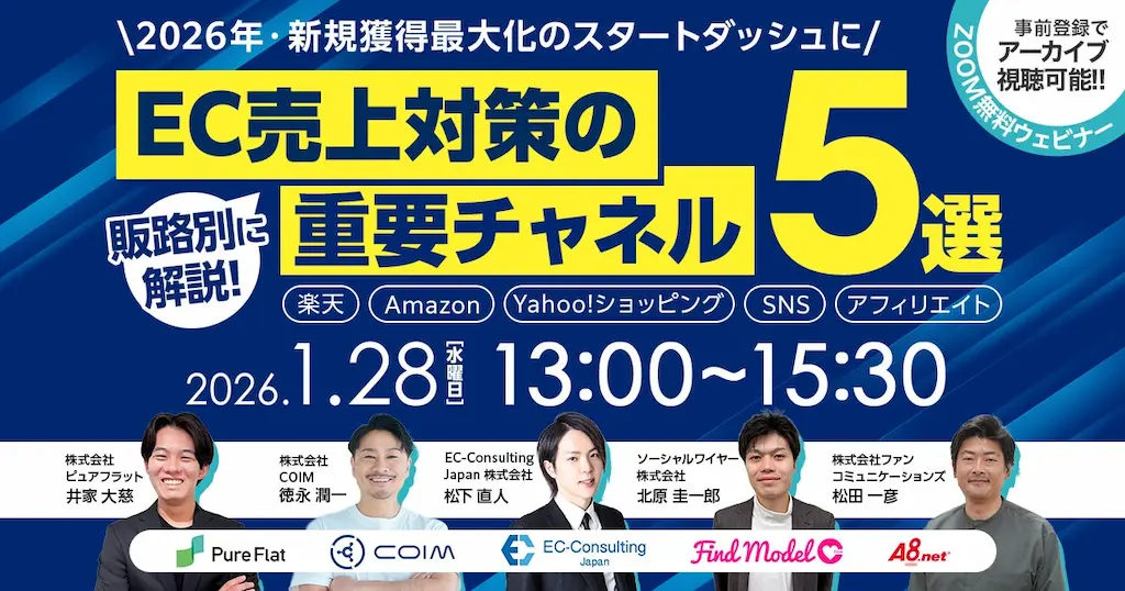 プロシューマー支援事業を展開する株式会社ファンコミュニケーションズ(本社:東京都渋谷区、代表取締役社長:二宮幸司 東京証券取引所プライム市場:2461)が運営する、国内最大級のアフィリエイトサービス「A8.net」は、1月28日(水)に株式会社ピュアフラット、株式会社COIM、EC-Consulting Japan株式会社、ソーシャルワイヤー株式会社との共催ウェビナー、「EC売上対策の重要チャネル 5選 ~楽天・Amazon・Yahoo!ショッピング・SNS・アフィリエイト~」に登壇いたします。