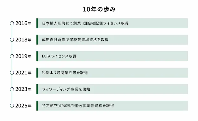 ECMSジャパンは2016年、日本橋人形町の事務所より越境EC物流事業をスタートしました。以来10年間にわたり、仕向地の拡大、ネットワーク強化、サービス機能の拡充を積み重ねてまいりました。この10年で蓄積した挑戦と改善は、いまの“物流界のLCCモデル”としてのECMSジャパンを形づくっています。