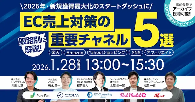 ECマーケティング会社 株式会社ピュアフラット(本社:東京都)は、楽天市場・Amazon・Yahoo!ショッピング・SNS・アフィリエイトといった主要ECチャネルを横断的に解説する無料オンラインセミナー「販路別に解説!EC売上対策の重要チャネル5選」を、2026年1月28日(水)に開催いたします。このセミナーは、AI時代の検索・購買行動の変化を踏まえた新規顧客獲得戦略をテーマに、モール・SNS・自社ECそれぞれの特性を活かした最新の売上対策を、実践事例とともに解説します。