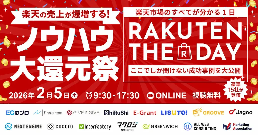ECサイトの運営代行サービスを提供しているマーケティングアソシエーション株式会社(本社:東京都台東区 代表取締役:中園広和、以下当社)は、2026年2月5日(木)に、株式会社WUUZY様主催のオンラインカンファレンス「楽天市場のすべてが分かる1日 RAKUTEN THE DAY 2026 ~日本中が楽天に染まる日-ここでしか聞けない成功事例を大公開~」にて登壇いたします。