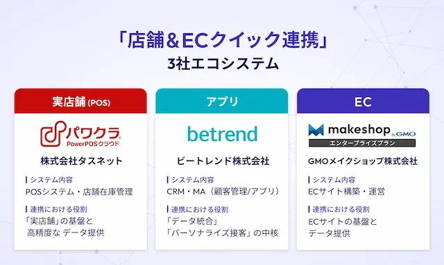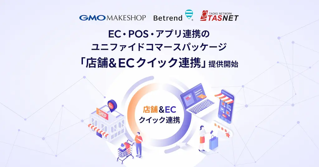 GMOインターネットグループのGMOメイクショップ株式会社(代表取締役社長CEO:向畑 憲良、以下、GMOメイクショップ)、株式会社タスネット(代表取締役社長:山田 和司、以下、タスネット)、ビートレンド株式会社(代表取締役社長:井上 英昭 以下、ビートレンド)は、小売業における店舗・EC・アプリのシームレスな連携を開発不要かつ最短1ヶ月で導入可能とする「店舗&ECクイック連携」を、2026年1月22日(木)より提供開始します。本パッケージは、3社の主力サービスである「makeshop byGMO エンタープライズプラン」(EC)、「パワクラ」(POS)、「betrend」(アプリ・CRM)を標準連携したオールインワンのユニファイドコマース(※1)パッケージです。在庫同期、ポイント統合管理、パーソナライズCRMを標準機能として提供し、最短1ヶ月で小売企業のユニファイドコマース基盤構築を可能にします。本パッケージにより、これまで分断されていたデータと業務を統合し、顧客満足度とロイヤリティを高める施策を加速します。これまで別々に最適化されてきたEC・店舗・アプリ領域において、3社が連携し、共通パッケージを共同提供する取り組みは業界でも先駆的で、小売企業にとってユニファイドコマース導入のコスト・スピード・品質を抜本的に改善する新たな選択肢となります。