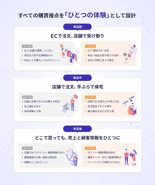 本パッケージにより、ECと店舗それぞれに分断されていた在庫、注文、ポイント、顧客データを横断的に統合し、来店前・来店中・来店後のすべての購買接点をひとつの体験として設計することが可能になります。ECでの事前注文や店舗での注文・配送対応、共通ポイントの活用を通じて、来店を確実な売上につなげるとともに、チャネルをまたいだ顧客理解と継続的な関係構築を実現します。