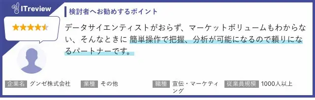 レビューでは、「商品開発」「販売商品の選定・仕入れ」「販売施策」などさまざまなシーンの中で合理的な判断をするにあたり欠かせないツールとしてご活用いただいているとのお声を多数いただいています。