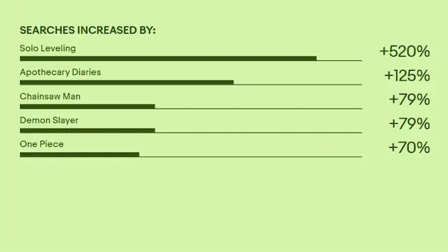 世界的な出来事や話題は、エンスージアストの検索・購買行動と密接に連動しており、特にコレクターズアイテムの検索数が急増することが多くあります。例えば、日本発信の漫画やアニメ、トレーディングカードが高い人気を誇り、「Solo Leveling(俺だけレベルアップな件)」(約520%増加)や「Apthecary Diaries(薬屋のひとりごと)」(約125%増加)などの作品に関連する検索数が大きく伸びています。