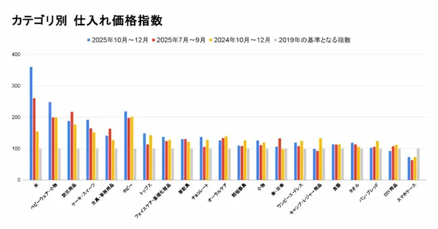 本レポートは、卸・仕入れサイト「スーパーデリバリー」における商品の仕入れ単価(1個あたり)の動向を、2019年を基準(=100)とした価格指数として分析したものです。2025年10月~12月のデータに基づき、主要ジャンルごとの価格変動を前期(2025年7月~9月)と比較しながら解説します。