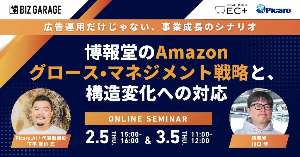 本セミナーでは、日本のトップブランドの日本及び海外におけるアマゾンビジネスの拡大をサポートする株式会社 Picaroの代表取締役 下平氏をお招きし、博報堂DYグループのEC領域の専門家集団であるHAKHODO EC+の川口とともに企業のAmazon事業の成否を分ける「解像度」と「貢献度」の正体を紐解きます。感覚的な運営を脱却し、運用の定義を「事業投資」へと昇華させることで、構造変化が激しい市場で勝ち続けるための「戦略的な羅針盤」を提示します。