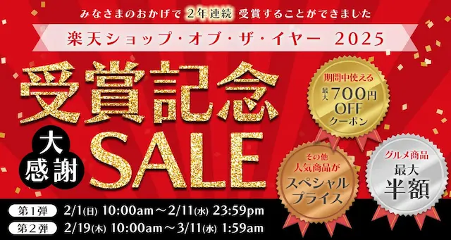 - 名称:楽天ショップ・オブ・ザ・イヤー2025 受賞記念SALE