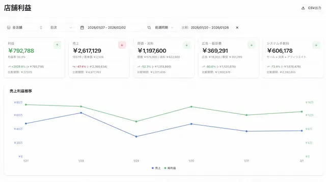 売上・費用・利益を自動集計し、日次単位で利益を可視化します。広告費・販促費・手数料や決済費用を含めた実態に近い利益を把握できます。