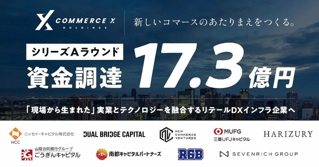 CommerceXホールディングス株式会社(本社:大阪府吹田市、代表取締役:佐藤秀平、以下「CommerceX HD」)は、このたびシリーズAラウンドにおいて、ニッセイ・キャピタル、DUAL BRIDGE CAPITAL、New Commerce Ventures、三菱UFJキャピタルなどを引受先とするエクイティ出資に加え、複数金融機関からのデットファイナンスを含め、総額17.3億円の資金調達を完了(予定含む)したことをお知らせいたします。